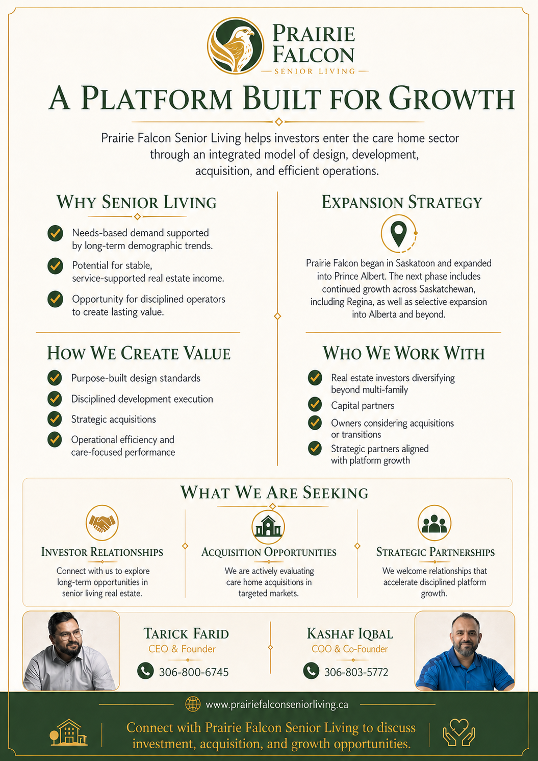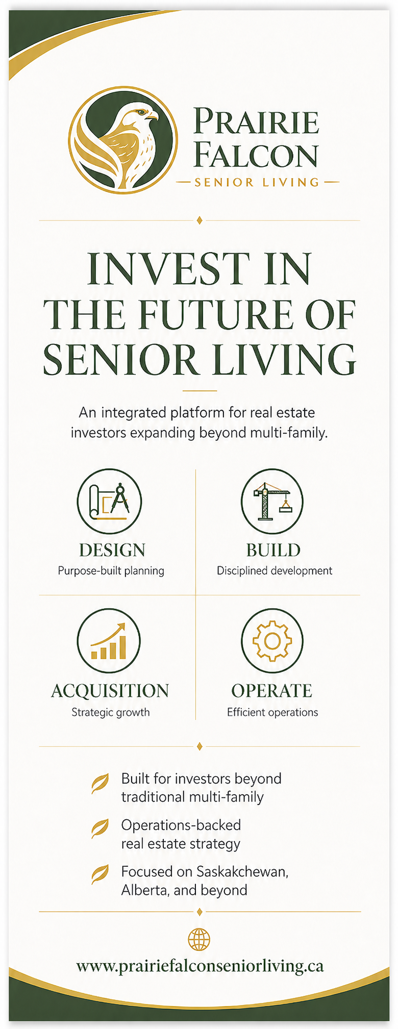 Let’s discuss how Prairie Falcon Senior Living is building a platform for investors seeking exposure to senior living across Saskatchewan, Alberta, and beyond.